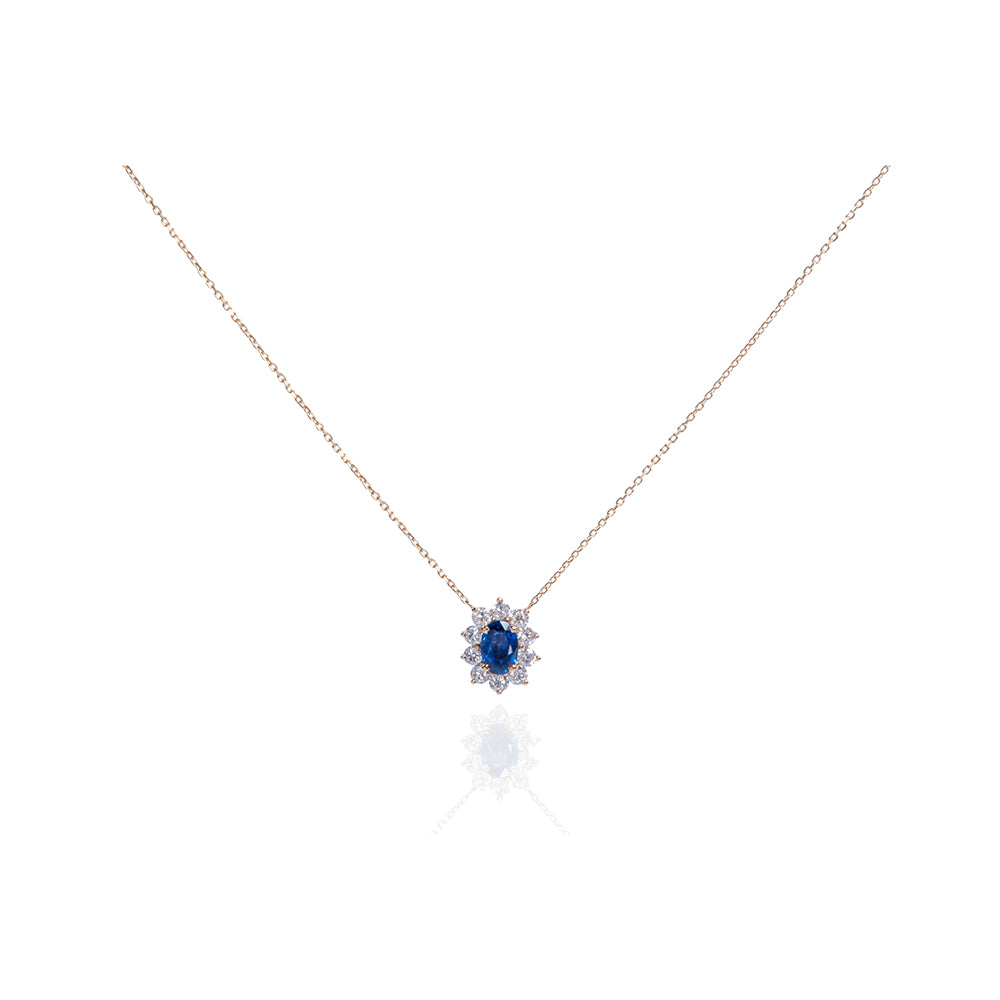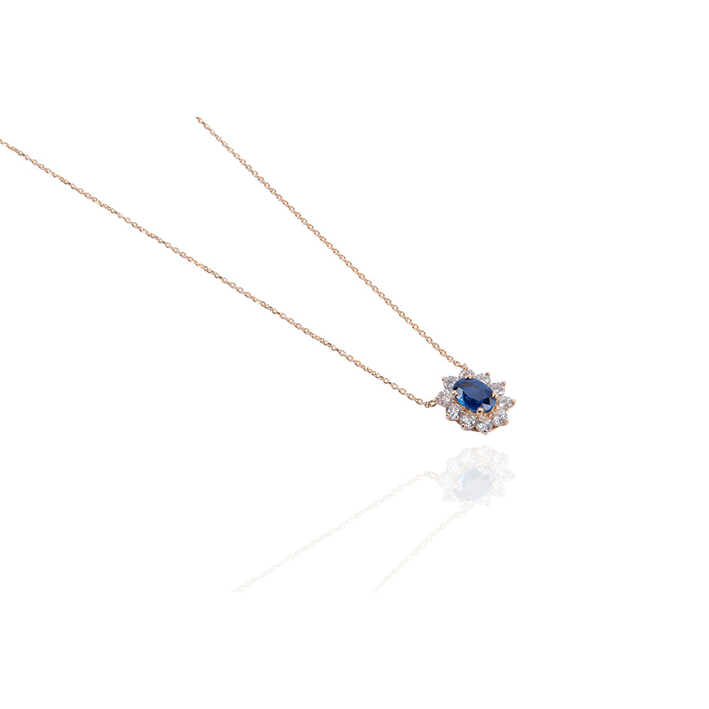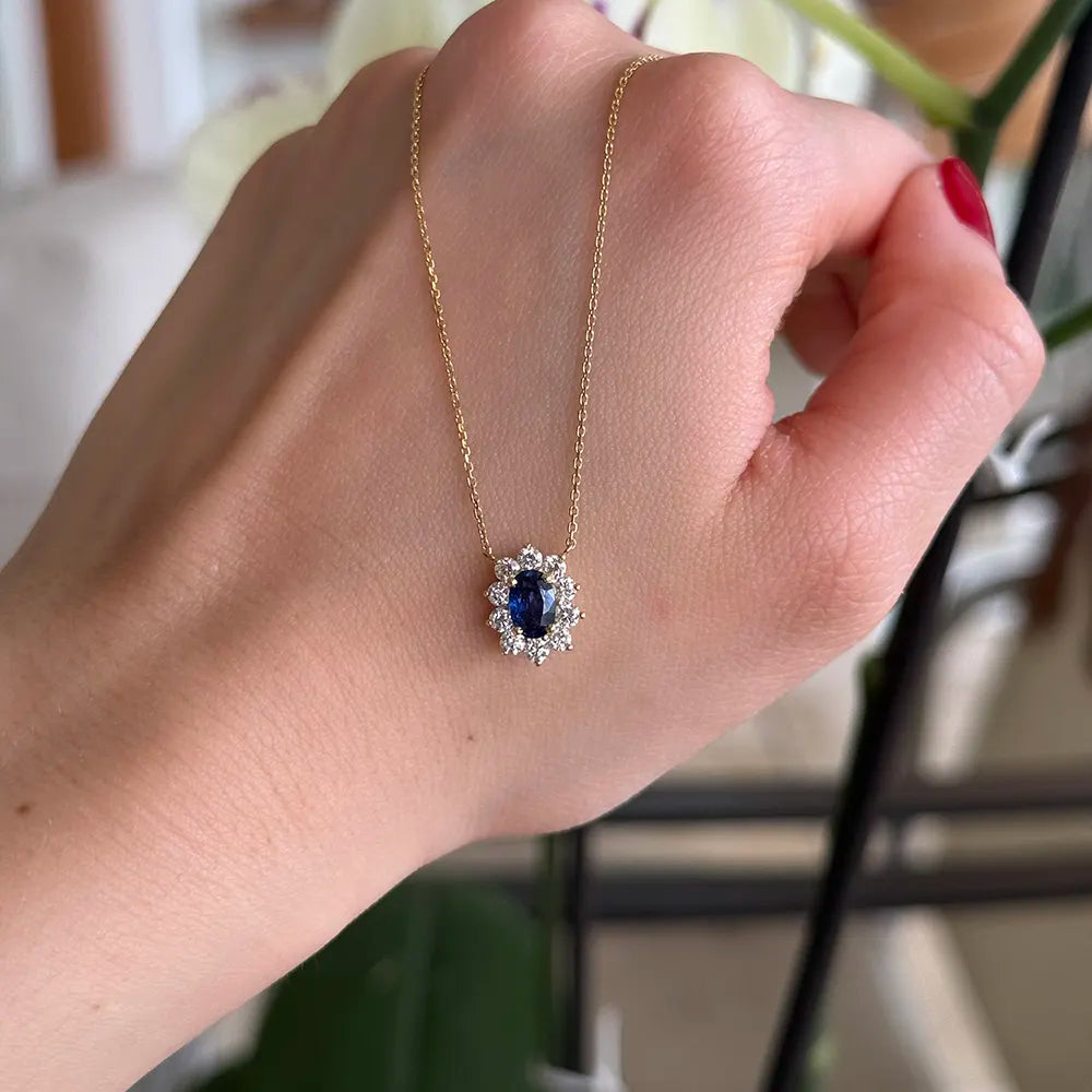 An oval sapphire of deep, velvety blue rests at the heart of Clair de Lune, its radiance encircled by a halo of brilliant diamonds. The composition, set in yellow gold, evokes the quiet shimmer of moonlight against a midnight sky — a jewel of unique beauty.