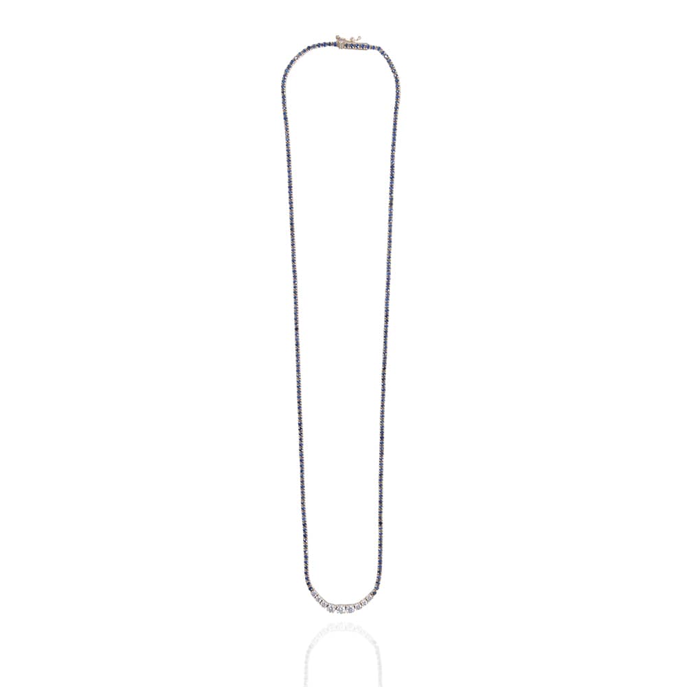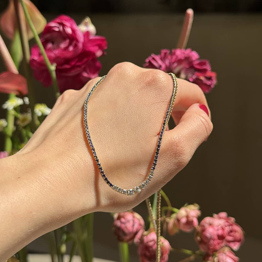 A sequence of sapphires and diamonds set in 18K gold, shifting from deep blue to light in a seamless flow. A design that captures contrast and harmony — perfect for wearing alone or layered as a modern statement.