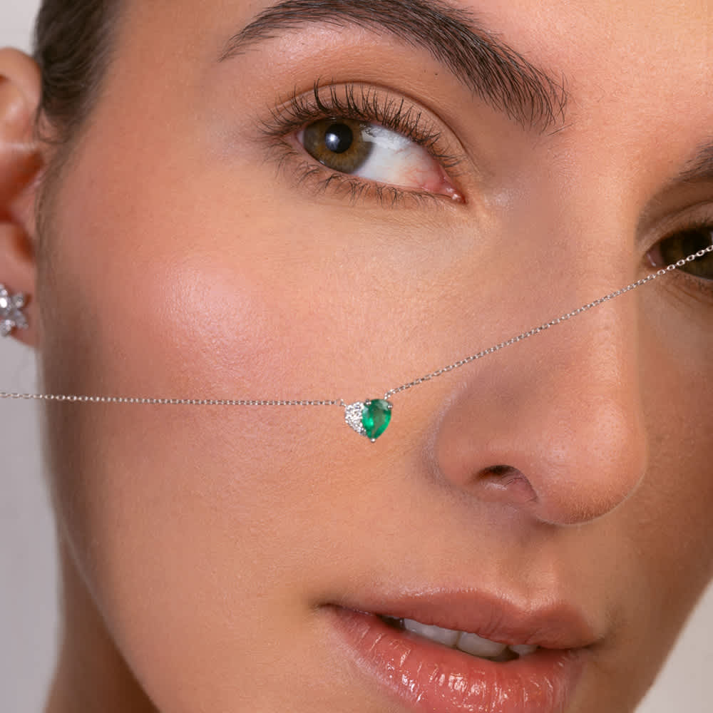 A pear-cut emerald embraced by a sweep of pavé diamonds forms a heart of quiet radiance—an emblem of emotion, captured in precious stones. Set in 18K gold, it rests delicately against the skin, catching the light with every movement. Graceful, fluid, and unmistakably refined, it’s a piece made to hold sentiment close.