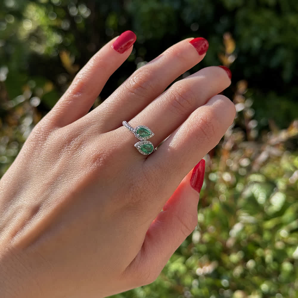 Two stones, one story — twin pear-shaped emeralds, each edged with diamonds, facing each other in sculptural symmetry. A ring that carries detail as both design and meaning, perfect for marking a bond that deserves to be lived in every day.