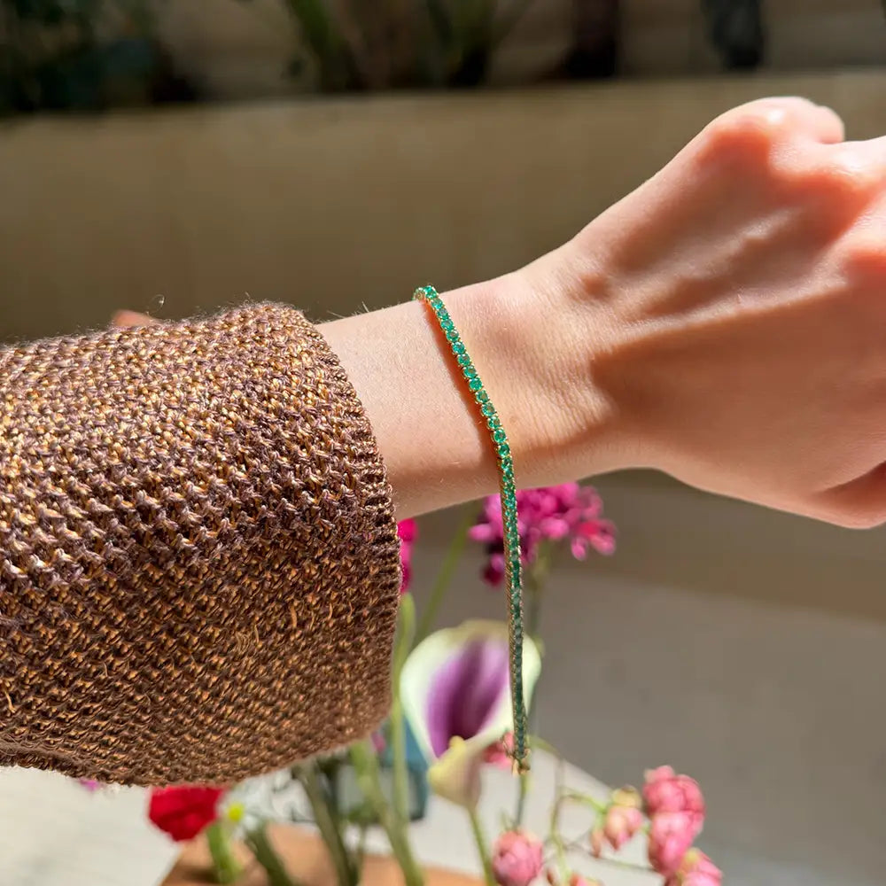A refined composition of vivid green Colombian emeralds, hand-selected for their exceptional color and clarity. Set in 18K gold with a total carat weight of 3.55cts, each stone is precisely aligned for a seamless, elegant silhouette. Designed for comfort and tailored to your perfect fit, this piece is an expression of enduring luxury.