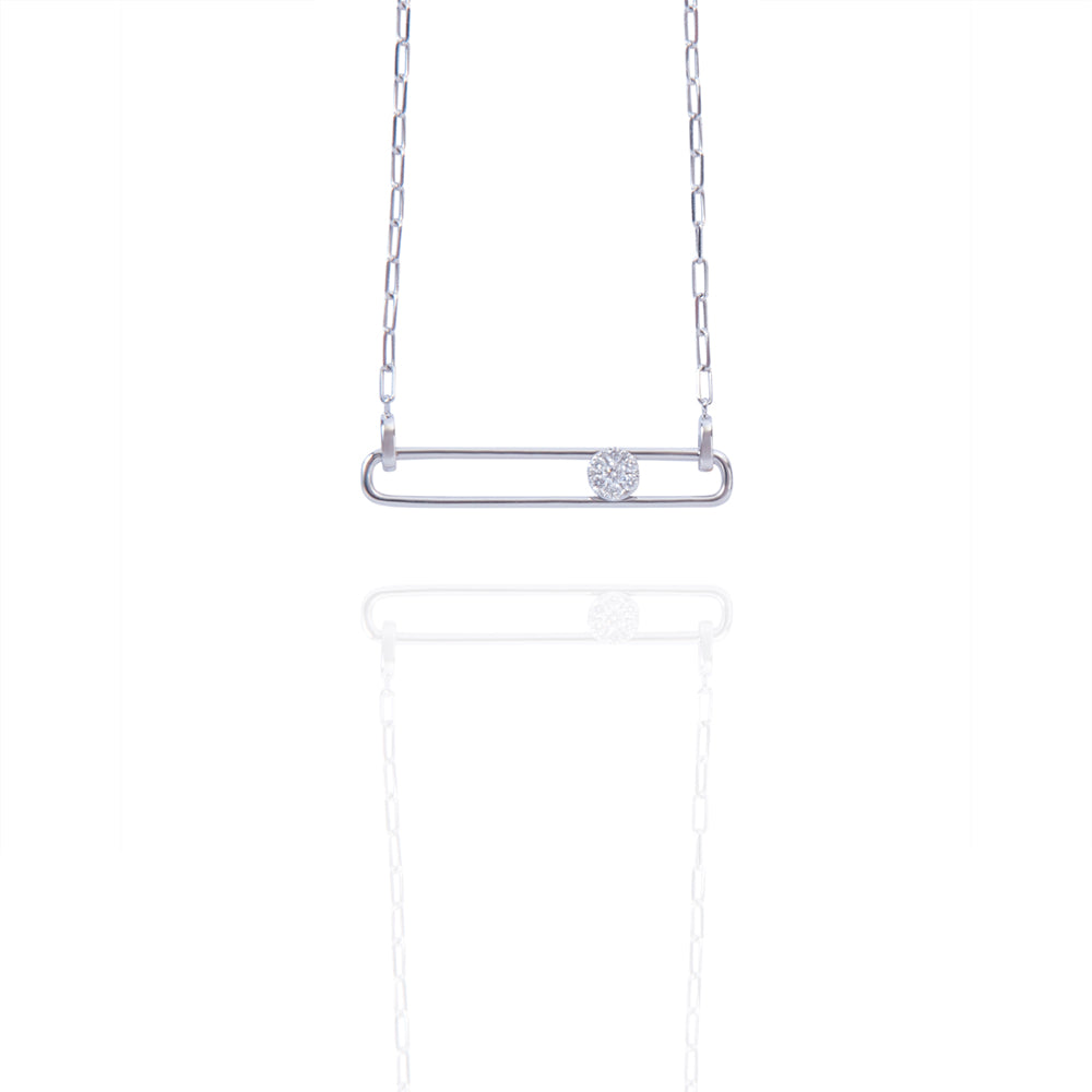 Our Moving Pavé Diamond Necklace features a captivating arrangement of illusion-set diamonds, designed to create the appearance of a larger, seamless brilliance. Suspended on a delicate chain, the diamond centerpiece glides effortlessly with every movement, catching and reflecting light from every angle. A masterpiece of fine craftsmanship, this necklace exudes modern elegance along with sophistication.