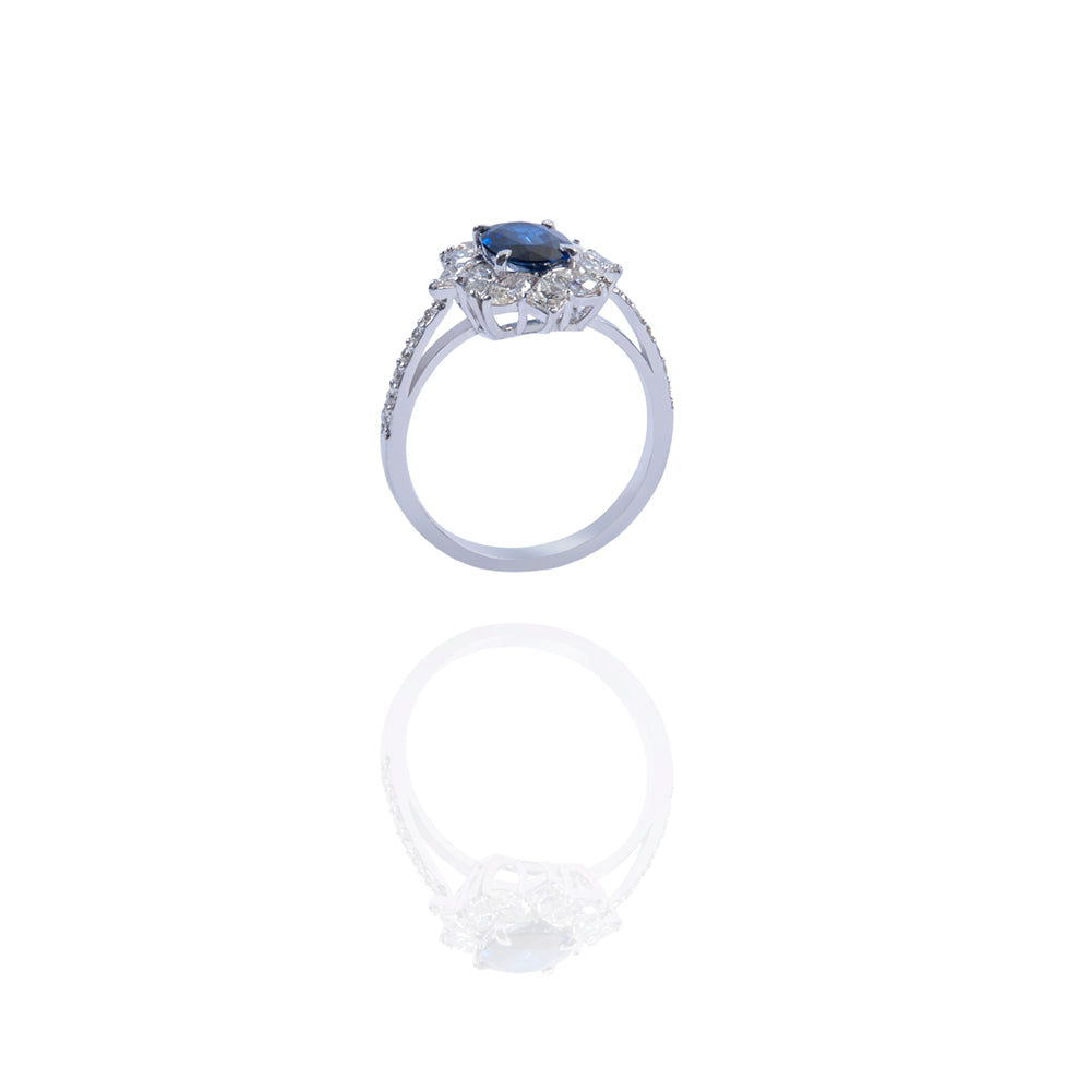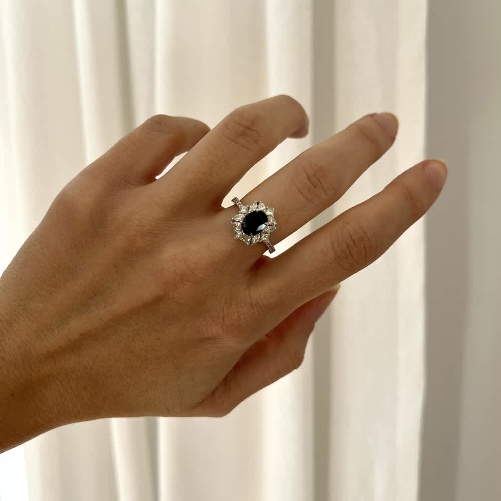 An oval sapphire of exceptional depth is encircled by a halo of diamonds. The mixed cuts refract light from every angle, giving the impression of movement across the stone’s surface. Finished with a slim, pavé‑set 18K gold band for a delicate yet elegant look.