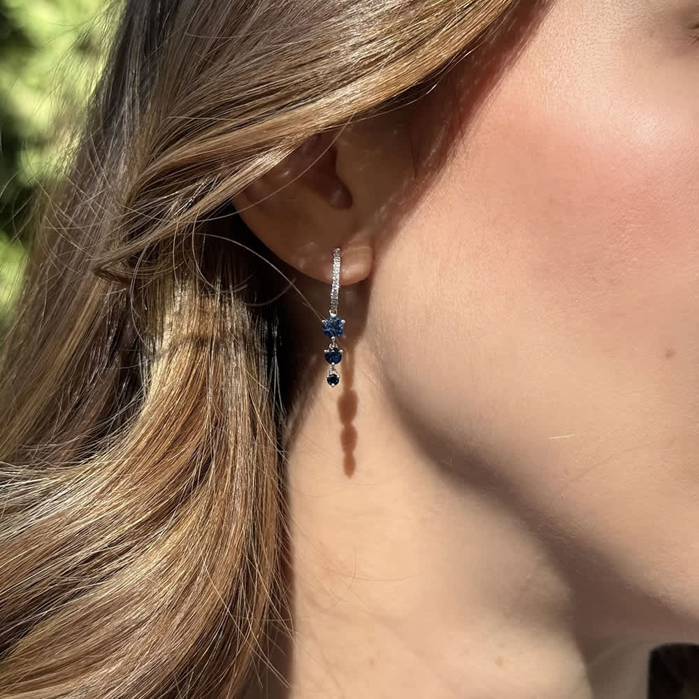 The Sapphire Cascade Hoops trace a gentle descent of blue, where graduated sapphires meet pavé diamonds in perfect rhythm. Designed to elongate and illuminate, each curve moves like a line of light in motion.