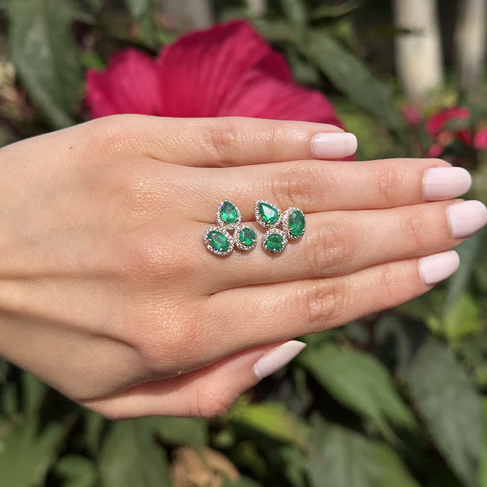 Three emeralds converge in a sculptural cluster framed by a subtle halo of diamonds. The Serene Emerald Earrings celebrate harmony and light — a composition that feels both refined and contemporary.