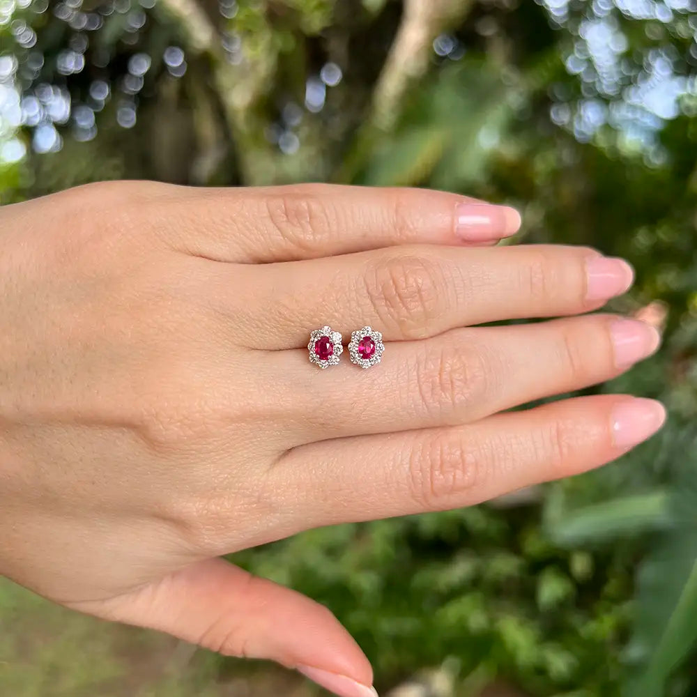 The Rouge Studs center an oval ruby, rich in hue, surrounded by a halo of brilliant-cut diamonds that amplify its radiance. Set in 18k gold, these studs are a signature statement, a timeless masterpiece.
