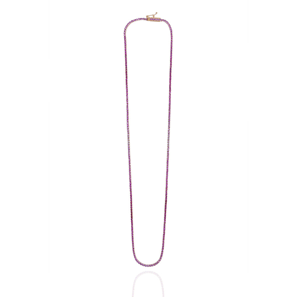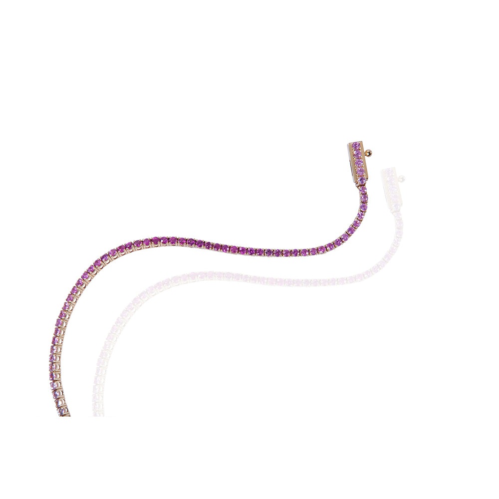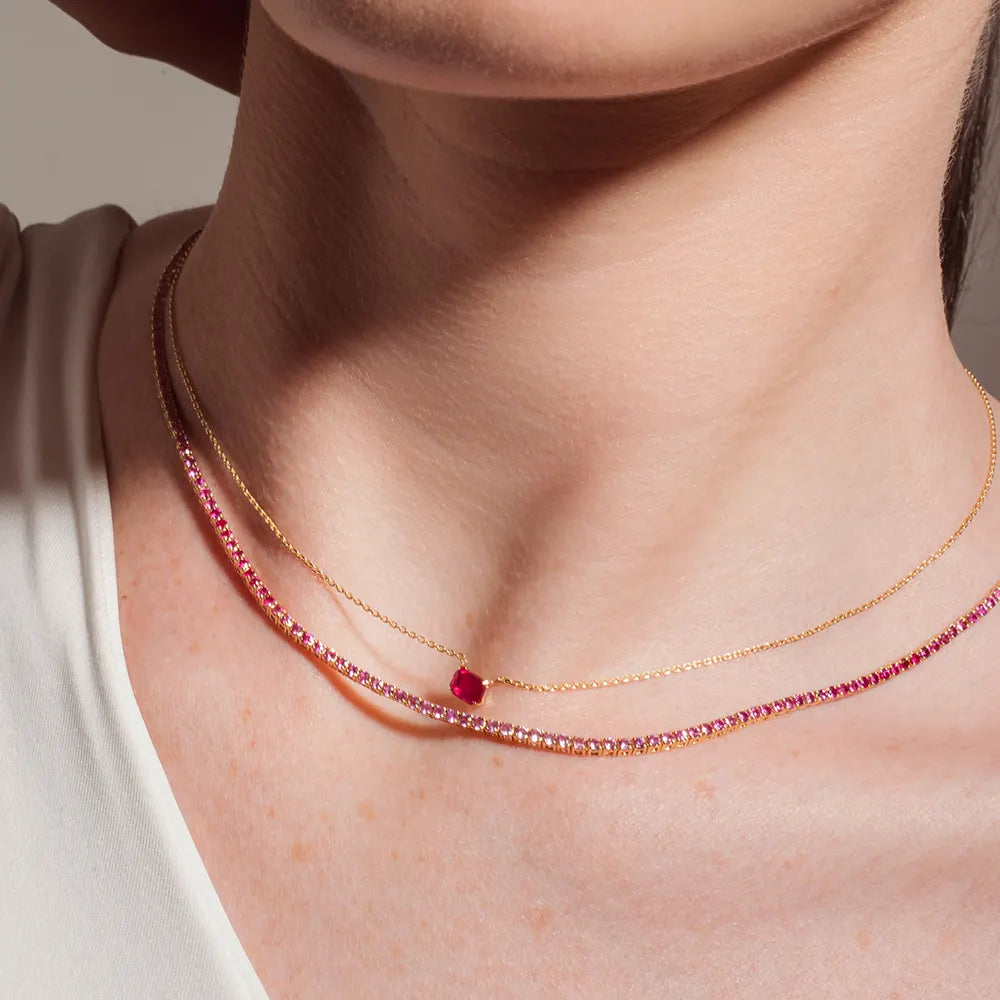 A masterful gradient of deep crimson to delicate rose, each ruby is selected for its saturation and color. Set in a fluid line of gold, the Rubis Dégradé Tennis embraces the neck with a seamless flow of color, an homage to rare craftsmanship and the majesty of color in motion.